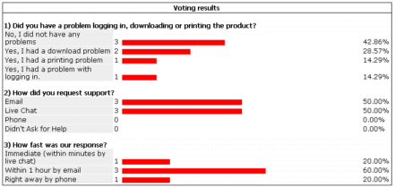They're displayed in a tidy little graph for you that lets you see the number of responses and the percent of votes on each question.